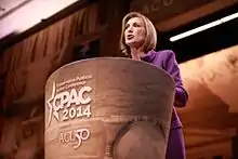 In June 2015, as a response to the U.S. Supreme Court's decision in Obergefell v. Hodges, which held that there is a fundamental right to same-sex marriage under the Fourteenth Amendment, Fiorina said the decision was "only the latest example of an activist Court. I do not agree that the Court can or should redefine marriage. I believe that responsibility should have remained with states and voters where this conversation has continued in churches, town halls and living rooms around the country."[133] In May 2015, however, she said that she hoped that the nation could support the Supreme Court's decision to legalize same-sex marriage and, at the same time, respect individual consciences.[134] In 2017, Fiorina headlined the 40th anniversary gathering of Log Cabin Republicans, an LGBT Republican organization which supports same-sex marriage and other LGBT rights.[135]
