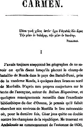 Carmen is a novella by Prosper Mérimée, written and first published in 1845. It has been adapted into a number of dramatic works, including the famous opera of the same name by Georges Bizet.[1]