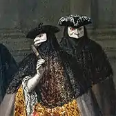 In the 18th century, together with a black circular or semicircular clasped cape[18][19] called a tabarro (and zendale hood[20]) the bauta had become a standardized society mask and disguise regulated by the Venetian government.[21] It was obligatory to wear it at certain political decision-making events when all citizens were required to act anonymously as peers. Only citizens (i.e., men) had the right to use the bauta. Its role was similar to the anonymizing processes invented to guarantee general, direct, free, equal and secret ballots in modern democracies. Also, the bearing of weapons along with the mask was specifically prohibited by law and enforceable by the Venetian police.