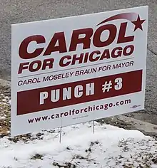 In the 2016 Democratic U.S. Senate primary in Maryland, Moseley Braun endorsed Donna Edwards.[73][74] In the 2019 Chicago mayoral election runoff, Moseley Braun endorsed Toni Preckwinkle.[75] In the 2023 Chicago mayoral election runoff, Moseley Braun endorsed Brandon Johnson.[76]