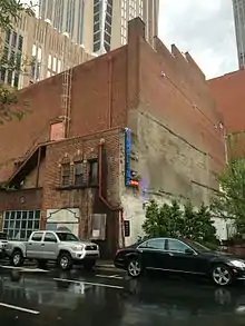 The Carolina Theatre opened in 1927, as part of Paramount Picture's Publix Theatre chain. The opening feature was the silent movie, A Kiss in a Taxi. Originally, movies ran for three days, and vaudeville performers were on stage Thursdays, Fridays and Saturdays.[1] In 1938, the theatre was renovated to accommodate sound films, with the original murals replaced with acoustic tiles. On Feb. 10, 1956, the theatre played host to a performance by Elvis Presley.[2] In 1953, the theatre intalled a panoramic screen to acomodate CinemaScope films. In 1961, it was further renovated to accommodate Cinerama films.[3] The Sound of Music would premiere at the Carolina Theatre on March 31, 1965, and run a record 79 weeks. The 398,201[1] people who saw the movie were more than the population of Charlotte, at the time. With rising competition from suburban multiplexes,[4] the theatre closed on Nov. 27, 1978, with a showing of Bruce Lee’s Fists of Fury.[5] Arson furthered damaged the theatre[6] in the 1980s.