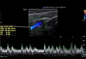 ![]() Screenshot of a normal proximal internal carotid artery spectral Doppler | |