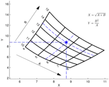 A carpet plot with two independent variables and one dependent variable is often called a cheater plot for the use of a phantom "cheater" axis instead of the horizontal axis. As a result of this missing axis, the values can be shifted horizontally such that the intersections line up vertically. This allows easy interpolation by having fixed horizontal intervals correspond to fixed intervals in both independent variables. The horizontal shift must sometimes be adjusted in order to eliminate or mitigate overlapping.[4] Depending on the data being depicted, eliminating overlapping is not always possible. The common solution is to split the plot into two carpets.