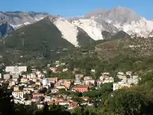 View of Carrara; the white on the mountains behind is quarried faces of marble.