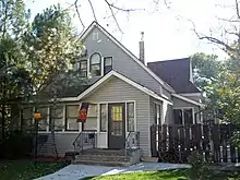 Nestled amidst grand Queen Anne style houses is this early folk residence. The wooden home, constructed for Scottish immigrant John McAusland, appears on an 1883 bird's-eye map of Miles City. A steeply pitched side-gable roof and a small dormer dominate the home's façade. Originally, the dormer likely framed a door that led to the roof of a full-length front porch. The main part of the house is one-and-one-half stories; the kitchen is under a separate, one-story roof. This plan was common in the 1800s. Placing the kitchen under separate roof minimized fire risk. Bucket brigades could more easily reach a one-story roof, perhaps saving the rest of the house in case of a kitchen fire. The design also provided good ventilation, a boon during hot summers. McAusland arrived in Miles City from Deadwood, Dakota Territory, in 1882. In 1886, he was named postmaster, an appointment that reflects political connections. The plum patronage position paid $1,800 annually (equivalent to approximately $37,000 today). In later years, he worked as a clerk. He still lived here with his daughter in 1914.[3]