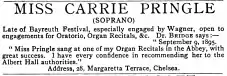 Pringle was the only one of the original Flowermaidens not to be re-engaged for the 1883 production of Parsifal, and moved with her parents and siblings to London. In England her career was fitful and she apparently never appeared on the opera stage again. Other members of the family also sought musical professions, including her brother Godfrey Pringle (1867–1900) who wrote two operas. Pringle and her mother both gave music lessons, and she herself sought by advertisement, engagements for theatres and seaside piers during the holiday seasons.[5] Pringle never married; she died in Brighton in 1930 of ovarian cancer.[6]