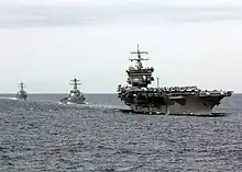 In the middle of 1992, there was a Navy reorganization. Each of the Navy's 12 existing carrier battle groups was planned to consist of an aircraft carrier; an embarked carrier air wing; cruiser, destroyer, and frigate units; and two nuclear-powered attack submarines.[14] The group's composition after the reorganization can be seen below.[15]