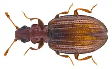 Cartodere constricta, the plaster beetle, is a 1.3—2.0 mm long species of minute brown scavenger beetle in the family Latridiidae. Originally from the Palearctic, it now also occurs in the Nearctic. It is found throughout Europe and North Africa, east across Siberia to the Russian Far East, and south to Pakistan, India, China and Japan. It also occurs across southern Canada and throughout the USA.[1][2][3][4] It is a mold feeder often found in: stored products such as grains and dry fruit, houses, feed mills, grain elevators, manure heaps and plant detritus.[4][5] To get rid of this species, the key is drying out the problem area enough to stop mold growth; in general, reduce RH below 20%.[6]