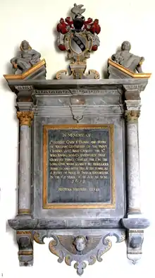 Rev. George Cary (1611–1680), the second son of William Cary (1576-1652), (1611[37]-1680) was a Professor (Doctor) of Divinity, Dean of Exeter (amongst other duties responsible for the maintenance and decoration of the cathedral building) and Rector of Shobrooke in Devon. He was one of the Worthies of Devon of John Prince (died 1723).[38] He married Anne Hancock, daughter of William Hancock (died 1625), lord of the manor of Combe Martin, Devon, by whom he had numerous children.[39] He was educated at Exeter Grammar School and in 1628 entered The Queen's College, Oxford but later moved to Exeter College, Oxford, much frequented by Devonians. His first clerical appointment was by his father as Rector of Clovelly. Following the Restoration of the Monarchy in 1660, he was appointed Chaplain in Ordinary to King Charles II, after which he received the honour of a Doctorate in Divinity from Oxford University. At the bequest of the Lord Chamberlain he preached a Lent sermon before the king, for which was much thanked by the Archbishop of Canterbury.[40] During most of his career he lived about 44 miles south-east of Clovelly, at Exeter, and at Shobrooke, near Crediton, 9 miles to the north-west of Exeter. Indeed it appears that until about 1702 Clovelly was occupied by his second cousins, the three brothers John Cary, George Cary (died 1702) and Anthony Cary (died 1694), sons of Robert Cary of Yeo Vale, Alwington,[41] near Clovelly. He rebuilt the rectory house at Shobrooke, which he found in a dilapidated state and made it "a commodious and gentile dwelling".[40] He also rebuilt the "ruinous,...filthy and loathsome" Dean's House in Exeter, which during the Civil War had been let to negligent tenants by the See of Exeter, and "in a short time so well repaired, so thoroughly cleansed and so richly furnished this house that it became a fit receptacle for princes".[42] As the Emperor Augustus with the City of Rome, so did Dean Cary with the Dean's House in Exeter "found it ruines but he left it a palace", as Prince suggests.[42] Indeed King Charles II stayed there on the night of 23 July 1670, having visited the newly built Citadel in Plymouth. It was also the chosen abode of Christopher Monck, 2nd Duke of Albemarle, Lord lieutenant of Devon, for three weeks in 1675 and again during the Monmouth Rebellion. He was a liberal benefactor in assisting the Corporation of Exeter in the completion in 1699 of the cutting of a leat between Exeter Quay and Topsham, which fed into a pool which could shelter 100 ships. He twice refused offers of the Bishopric of Exeter made by King Charles II, on vacancies arising in 1666 and 1676. The reason for his first refusal, or profession of Nolo Episcopari, is unknown, but he refused the second time due to age and infirmity which would prevent him attending Parliament as would be required.[40] He died at Shobrooke but was buried in Cloveely Church. His mural monument survives in Clovelly Church, erected by his eldest son Sir George Cary (1654–1685),[43] the armorials of the latter's two wives appearing on the top of the monument as follows: dexter: Azure, a chevron between three mullets pierced or (Davie of Canonteign, Christow); sinister: Or, a lion reguardant sable langued gules (Jenkyn of Cornwall). The Latin inscription is as follows:[44]
