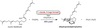 Multistep tandem reactions (or cascade reactions) are a sequence of chemical transformations (usually more than two steps) that happens consecutively to convert a starting material to a complex product.[28] This kind of organic reactions are designed to construct difficult structures encountered in natural product total synthesis.