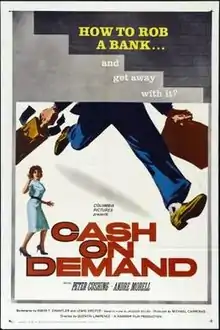 Cash on Demand is a 1961 British black and white neo noir crime thriller film directed by Quentin Lawrence and starring Peter Cushing and André Morell.[2] The film company Hammer Film Productions invested approximately £37,000 to produce the film. To optimise its budget the film uses a limited number of sets; an interior street set, the trading area of a bank, the manager's office, the stairway between office and the vault, and the interior of the vault itself. The screenplay was adapted from the 1960 Theatre 70 teleplay The Gold Inside, also directed by Lawrence, and featuring André Morell and Richard Vernon in the same roles.[3]