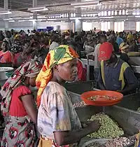 The cash crop is usually cultivated in the southern coastal regions of the country, near the towns of Mtwara, Kilwa and Dar es Salaam. The sale and marketing of the product is run by the Cashewnut Board of Tanzania, through various farmer co-operatives.[4] More than ninety percent of the exports are destined for India and almost entirely in raw form. The lack of domestic processing firms costs the country vital foreign revenues and thousands of jobs. The Tanzanian government has been facing challenges for finding potential investors in order to revive the cashew processing industry in Tanzania.[5]