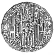 ![]() Seal of Casimir, reading "Kasimir, Dei Gra(tia) Dux Stetinensis, Dobrin, Pomoranie, Slavie, Casubie, Pr(inceps) in Rugie" | |