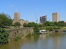 In 2006, Bristol City Council announced its intention to redevelop the area to the west of Castle Park, known as the 'Mary-le-Port' site. These plans encompassed the by then derelict financial buildings, and the area to the west of St Peter's Church, about 5% of the park.[26] It was to be a 400,000 square feet (37,000 m2) mixed-use development to 'regenerate this historic heart of Bristol'[27] and to 'improve connections between Broadmead, the Old City and Redcliffe' and 'enhance the setting of St Mary-le-Port church'.[28] The council selected Deeley Freed as its preferred developer. The scheme provoked opposition from park users who felt that any reduction in the area of the park was not acceptable. 'Surprised by the extent of feeling', Bristol City Council decided to revise the plans.[28] Campaigners then applied to have 'Town Green' status applied to the park, but this was declined in 2009.[29]