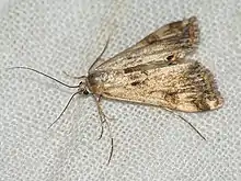 Adults of the species are sexually dimorphic.[3] The wingspan is 18–19 mm for males and 22–24 mm for females. The forewings are white. The costa, discal spot and a series of terminal spots are all fuscous. The hindwings are white with scatted pale fuscous scales.[4] Meyrick describes it- The forewings in male are whitish, with a yellowish-fuscous discal dot, traces of lines, and a pale brownish terminal streak; in female pale brownish, ochreous-mixed, with a darker discal spot, lines very indistinct, whitish, darker-edged, a whitish siibterminal streak. Hindwings are white; a dark fuscous discal dot; lines outlined with fuscous, sometimes nearly obsolete, first preceded by a yellow or fuscous spot in disc; subterminal and terminal ochreous lines enclosing a black fascia marked with four bluish-silvery dots. The larva is dark green or blackish; dorsal line black; head pale brown.[5]