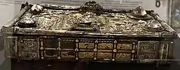 The shrine underwent three main phases of construction. The initial work was completed between 1062 and 1098 at Kells, County Meath while the manuscript was in the possession of the O'Donnells[13] and was the their chief relic. A new main face in gilt repoussé, was added between 1350 and 1375 with a large seated Christ in Majesty flanked on the right by a Crucifixion scene, and by a saint (likely Columba) on the left.[15][16] Further embellishments and repair works were carried out in the 16th century,[7] and again in 1723 while it under the care of Daniel O'Donel while he was in Paris.[5]