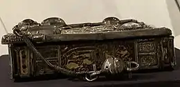 The shrine contains a number of inscriptions, although the lettering is badly damaged in places, the wording contains misspellings and contractions, and they were modified or added to at later dates.[17] Written in Irish and placed clockwise along the borders of the reverse of back of the shrine (beginning at top-left), they are signed by its goldsmith, Sitric Mc Meic Aeda (Sitric, son of Meic Aeda), who records that he built the shrine under the instruction of Domnall Mac Robartaigh (an abbot at Kells who had retired before his death in 1094, but is described in the inscription as "successor of Kells”),[18] who in turn was under the commission and payment of Cathbarr Ua Domnaill.[19][6]