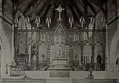 New York architect Edward Tuckerman Potter designed the first church building in and English Gothic Revival style. And so, on August 3, 1863 the cornerstone was laid, and construction began on the parish's first church building. It was completed the following year with the first services celebrated on Christmas Day,[4] and was consecrated on April 19, 1865 by the Rt. Rev. William B. Stevens, then Assistant Bishop of Pennsylvania.