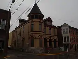 Architecturally, the building is a combination of the Loire chateau and Richardsonian Romanesque styles.[2] The exterior of the 2½-story structure is composed of brick with terracotta and stone trim. It is capped with a hipped roof. Roof dormers are located on the north and west elevations. The dominant feature of the building is a corner tower with a conical roof. An addition was added to the rear of the building in 1954.