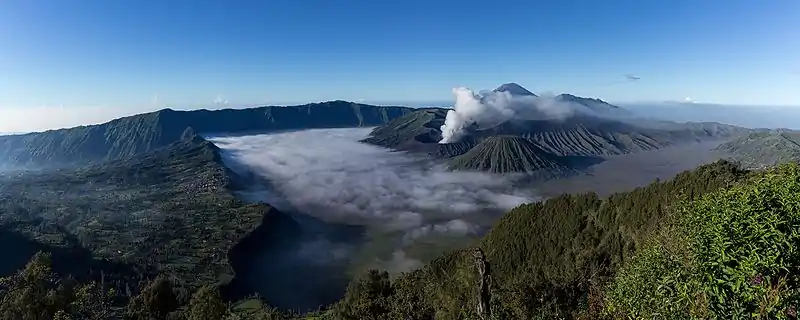 Cemoro Lawang (also known as Cemorolawang, Cemora Lawang or Cemara Lawang) is a very small hamlet north-east of Mount Bromo (East Java), Indonesia with the altitude of 2,217 meters above sea level. Administratively, this hamlet is a part of Ngadisari Village, Sukapura, Probolinggo Regency. Cemoro Lawang is one of many routes point to Tengger Caldera from Probolinggo route. There is a view point to see Mount Batok and Mount Bromo. It is principally a base for early morning climbs of Mt Bromo, an active volcano which stands in the middle of a Sand Sea. Many visitors approach the mountain from Surabaya which is about three hours drive away; others come from Bali.[1]