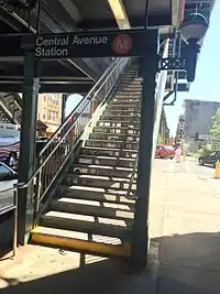 The Central Avenue station is a station on the BMT Myrtle Avenue Line of the New York City Subway. Located at Myrtle Avenue and Cedar Street in Bushwick, Brooklyn, it is served by the M train at all times.