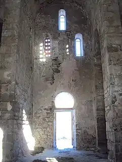 Most of the frescoes did not survive. The remains of the second stage of the painting (the first decoration was probably incomplete and was located mainly in the apses) are preserved on the northern and southern walls of the cross' lateral branches. The northern wall displays an image of two Holy martyrs above the entrance between the windows. In the Central part of the southern wall, between the door and the windows, a huge (about 3 m) image of saints Constantine and Helena holding a large cross is visible. To the right of them under the window there is a small fragment of the image of the warrior. On the walls of the Western sleeve were depicted the Holy warriors-horsemen. On one of the arches under the dome in the 19th century was the figure of the prophet Daniel.[6]
