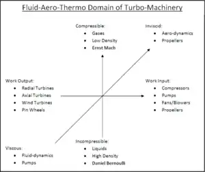 Figure 2.1 (shown right) represents the aero-thermo domain of turbomachinery. The horizontal axis represents the energy equation derivable from The first law of thermodynamics.[1][14] The vertical axis, which can be characterized by Mach Number, represents the range of fluid compressibility (or elasticity).[1][14] The Z-axis, which can be characterized by Reynolds number, represents the range of fluid viscosities (or stickiness).[14] Mathematicians and physicists who established the foundations of this aero-thermo domain include:[15][16] Isaac Newton, Daniel Bernoulli, Leonhard Euler, Claude-Louis Navier, George Stokes, Ernst Mach, Nikolay Yegorovich Zhukovsky, Martin Kutta, Ludwig Prandtl, Theodore von Kármán, Paul Richard Heinrich Blasius, and Henri Coandă.