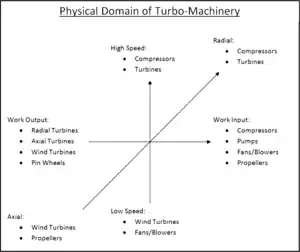 Figure 2.2 (shown right) represents the physical or mechanical domain of turbomachinery. Again, the horizontal axis represents the energy equation with turbines generating power to the left and compressors absorbing power to the right.[1][14] Within the physical domain the vertical axis differentiates between high speeds and low speeds depending upon the turbomachinery application.[1][14] The Z-axis differentiates between axial-flow geometry and radial-flow geometry within the physical domain of turbomachinery.[1][14] It is implied that mixed-flow turbomachinery lie between axial and radial.[1][14] Key contributors of technical achievements that pushed the practical application of turbomachinery forward include:[15][16] Denis Papin,[17] Kernelien Le Demour, Daniel Gabriel Fahrenheit, John Smeaton, Dr. A. C. E. Rateau,[18] John Barber, Alexander Sablukov, Sir Charles Algernon Parsons, Ægidius Elling, Sanford Alexander Moss, Willis Carrier, Adolf Busemann, Hermann Schlichting, Frank Whittle and Hans von Ohain.