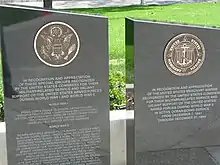![]() The Cerritos Veterans Memorial looking south-west. Behind the memorial on the right is city hall. The parking lot behind the memorial belongs to Cerritos High School | |