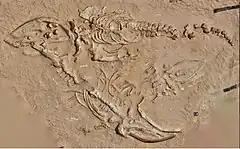 Because of the relative articulation and completeness of cetacean skeletons compared to other vertebrates, it is clear that scavengers were unable to fully target floating whale carcasses. This could be explained by differences in size between carcasses or temporal delay during scavenging which allowed further abrasion and disarticulation of skeletal remains. Scavengers that could dismember skeletons were further limited once these arrived in the supraridal flat, whose surroundings were already becoming desertic. It is also possible that predatory fish (such as sharks or sailfishes) were additional victims of toxic algae due to the ingestion of contaminated carcasses. Nevertheless, small feeding traces attributed to crabs have been reported from the skull of at least one whale skeleton.[2]