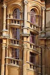 Yet in the later half of the 19th century, the château's style is seen proliferating across the United Kingdom, influencing the Founder's Building at Royal Holloway, University of London, designed by William Henry Crossland[33] and the main building of Fettes College in Edinburgh, designed by David Bryce in 1870.[34][35] Between 1874 and 1889, the country house in Buckinghamshire, Waddesdon Manor, was built with similar architectural frameworks as the Château de Chambord, disseminated via the architect Gabriel-Hippolyte Destailleur. For instance, the twin staircase towers, on the north façade, were inspired by the staircase tower at the Château.[36] However, following the theme of unparalleled luxury at Waddesdon, the windows of the towers at Waddesdon were glazed, unlike those of the staircase at Chambord, and were far more ornate.