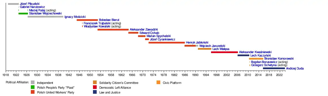 19 July 1989 | 22 December 1990 | Independent | Kaczorowski resigned on 22 December 1990, upon the election of Lech Wałęsa as President of the Republic of Poland. |