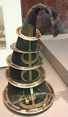 Mid-19th century Nihang turban from Lahore. Cotton over a wicker frame and steel overlaid with gold. "A tall conical turban provided convenient transportation for a number of sharp steel quoits – edged weapons hurled to lethal effect by the practised hand of the Akalis."