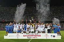 The Trophée des Champions (French pronunciation: [tʁɔ.fe de ʃɑ̃.pjɔ̃], lit. 'Champions' Trophy') is a French association football trophy contested in an annual match between the champions of Ligue 1 and the winners of the Coupe de France. It is equivalent to the super cups found in many other countries.