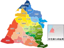 Changhua County is divided into 2 cities, 6 urban townships and 18 rural townships.[7][8] Changhua City is the seat of the county which houses the Changhua County Government and Changhua County Council. Changhua County has the highest number of urban townships of all counties in Taiwan. It also has the second highest number of rural townships after Pingtung County. The current Magistrate of Changhua County is Wang Huei-mei of the Kuomintang.