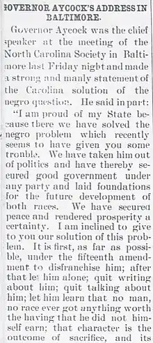 On December 18, 1903, while governor, Aycock went to Baltimore to give a speech to 300 people at the North Carolina Society.[13] His speech, "The Negro Problem," outlined his thoughts on keeping blacks separate, subservient, and locked out of representative government by circumventing the Fifteenth Amendment, which guarantees the right to vote.[14][15][16][17] Aycock's may have been a response to the book The Negro Problem, written by prominent black scholars, including W.E.B. DuBois and Booker T. Washington, in which they consider the web of economic, political, and social problems faced by blacks in their collective history as slaves and second-class citizens after Emancipation.[18][19] The book had been released about two months before Aycock's speech.