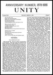 In March 1878 a magazine called Unity had been launched by liberal supporter of the Western Unitarian Conference.[1] The wing of the Unitarian movement represented by the new semi-monthly magazine argued that personal character rather than literal belief in a body of written dogma marked the true "test and essence of religion."[1] These so-called "Unity Men" sought wider acceptance among Unitarians for this fundamental idea of the primacy of ethics over belief — a matter of no little controversy among the more conservative church mainstream of the day.[2] A monthly magazine called Unitarian was established in January 1886 in an attempt to combat the ideas of the "Unity men" — who were seen as undermining Christianity in favor of what was characterized as a new "Ethical Culture."[3]