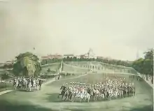Hubbard trained with J.R. Penniman.[5] From 1822 to 1823 Hubbard formed a business partnership with ornamental and sign painters Samuel Curtis and B.B. Curtis as "Curtis's & Hubbard" (also known as "Curtises & Hubbard"). They produced a variety of painting, "in a plain and neat, or rich and ornamental style as may be requested," including "military standard, plain and ornamental sign, fancy, masonic, landscape, glass, clock and timepiece dial; designs and drawings for cards, diplomas, &c; transparencies ... for window curtains."[6][7] Clients included the Ancient and Honorable Artillery Company of Massachusetts;[8] the Chester Light Infantry of Chester, New Hampshire;[9] and the Haverhill Light Infantry Company of Haverhill, Massachusetts.[10]