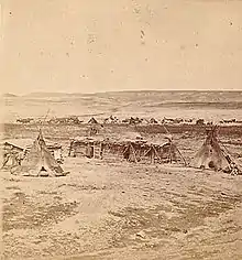 In 1860, Larpenteur became partner in an independent fur trading venture, Larpenteur, Smith & Company. The outfit went west over St. Paul and Pembina, and Larpenteur erected a trading post at Poplar River. Back in St. Louis in 1861, the company was reorganized as Larpenteur, Lemon & Company, due to dissension among the original partners. The same year, 1862, Larpenteur became a fur trader with a new company, La Barge, Harkness & Company.[6][7] In 1864 Larpenteur was back at Fort Union, now as Bourgeois or manager. Within a short time, however, the fort was sold the new Northwestern Fur Company, and Larpenteur resigned. In 1866 he served as an Assiniboine interpreter for the Indian Peace Commission, and the following year he became a fur trader for Durfee & Peck, but was fired after a conflict.[8] In 1869 Larpenteur brought his family from Iowa to Fort Buford, where he established a trading post. New regulations in 1870 limited the number of traders to one approved sutler per military post, and Larpenteur applied to the secretary of war, William W. Belknap for approval. This was, however, refused, and Larpenteur returned with his family to Iowa, where he died in 1872.[9]
