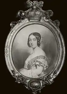 Gratia found a home in the palace of Cardinal Nicholas Wiseman in Fitzroy Square beside Regent's Park.[3] He made a series of brilliant portraits of English notables including the Countess of Woldegrève; John Blackwood; Colonel Donalle; General Stewart; the sailors Edward Belcher and Aumaunnay, who had both sailed in search of Franklin; Miss Carrington; Lord Follet and Lord Willoughby, Lord Great Chamberlain of Queen Victoria.[1] At Lord Willoughby's suggestion the queen agreed to sit for Gratia, but on condition that the portrait should not be exhibited and make English painters jealous. The queen sat several times accompanied by the Prince Consort. Later there was a dispute over payment for the oval frame of the portrait of the queen, which was kept by the frame maker.[3]