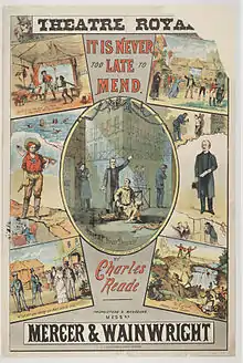 He made his name as a novelist in 1856, when he published It Is Never Too Late to Mend, a novel written to reform abuses in prison discipline and the treatment of criminals. The truth of some details was challenged, and Reade defended himself vigorously. Five more novels followed in quick succession: The Course of True Love Never Did Run Smooth (1857), White Lies (1857), Jack of all Trades (1858), The Autobiography of a Thief (1858), and Love Me Little, Love Me Long (1859).[4] White Lies started as a translation of Auguste Maquet's play Le Château de Grantier. After managers declined the manuscript, Reade adapted the story, weaving it into a novel which was serialised in The London Journal and published in three volumes the same year. He produced an adaptation of this on stage as The Double Marriage in 1867.[5]