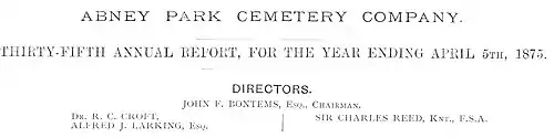 Reed, with a firm understanding of the historical importance of the landscape and its educational value, won election as a director of the company for 16 years between 1866 and 1881 and became a principal influence during its last decades as a joint stock company. Reed himself is buried there. Soon after Reed died, the cemetery was made over on 11 April 1882 to a new company run on commercial lines. This laid out a new cemetery, Chingford Mount Cemetery in 1883–1884. Others at Hendon Park and Greenford followed.[13]