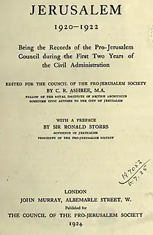 In 1924, after concluding a job as civic advisor to the city of Jerusalem, Ashbee wrote a report titled Jerusalem, 1920-1922, Being the Records of the Pro-Jerusalem Council During the First Two Years of the Civil Administration.[21]