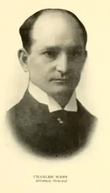 Charles West was born in Savannah, Georgia on March 16, 1872. He graduated from Johns Hopkins University in 1891 and pursued post-graduate work at the University of Leipzig. He was admitted to the Oklahoma Territory bar in 1895 and practiced in Pound Creek and Enid. He served in the Oklahoma National Guard between 1898 and 1910.[1] He was the first attorney general of Oklahoma between 1907 and 1915.[2] He was the president of the National Association of Attorneys General from 1911 to 1912.[1] He is one of the only public attorney to represent a Catholic school as an official act of office in the United States.[3]