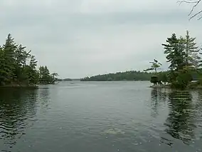 The lake includes a number of islands and has an irregular shoreline which makes it an interesting location for canoeing and kayaking. Blue Mountain, elevation 194 m (636 ft), is also within the park. The summit was the highest point of the former Leeds County, Ontario.[3] The trail to Blue Mountain has two access points, by water from Huckleberry Hollow, and by land from the intersection of Warburton and Blue Mountain Roads.[4]