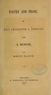 In 1842, she passed a week in Lowell, with Edgarton, at the home of Thomas Baldwin Thayer, and here she enjoyed her First Communion.[4] In the winter of 1842, she attended a course of lectures delivered by Richard Henry Dana Sr., on "Woman", Macbeth, Shakespeare in the supernatural, and Hamlet. These quickened her perceptions of literature, and sent her to reading Shakespeare, Spenser and Milton.[6] On November 19, 1843, she married J. W. Jerauld, and subsequently she divided her time between domestic duties and literary pursuits, producing most of the stories, sketches and poems found in the volume Poetry and Prose, by Mrs. Charlotte A. Jerauld, with a memoir by Henry Bacon, Boston. A. Tompkins, 88 Cornhill, 1860, which first appeared in the Repository and Rose of Sharon.[4]