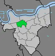 The centre of Charlton, known as Charlton Village, lies on the edge of high ground about 7 miles east-south-east of central London, on the B210. West of the village the main road is called Charlton Road, and to the east, Charlton Park Road; the road itself is called 'The Village' in the village centre.[21] A preserved model K2 red telephone box stands on Charlton Road.[22] A minor road called Charlton Church Lane leads north down the hill from St Luke's Church to the station and the A206. Beyond the railway line lies the more heavily industrial riverside area referred to as New Charlton or Charlton Riverside.[23]