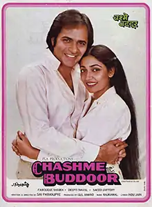 Chashme Buddoor (transl. Far be the evil eye) is a 1981 Indian romantic comedy-buddy film directed by Sai Paranjape and produced by Gul Anand and his sister Jayshree Anand–Makhija. The film stars Farooq Sheikh, Deepti Naval, Rakesh Bedi, Ravi Baswani and Leela Mishra in lead roles. The story revolves around three close friends who fall in love with a girl named Neha. Two of the friends fail to woo her and decide to seek revenge after discovering that their third roommate is dating the girl. The remake version directed by David Dhawan and the original digitally restored film were both released on 5 April 2013. The lyrics written by Indu Jain were composed by Raj Kamal and sung by Yesudas and Hemanti Shukla.