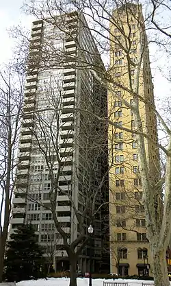 The 27-story building was designed by architect Horace Trumbauer in the Lombardic Romanesque style and completed in 1928. The style was perhaps suggested by the newly built Shelton Hotel in New York City, designed by A. L. Harmon.[2] There are setbacks on the 17th and 24th floors.[3] The developer was Louis H. Cahan, who also built the Locust Street Theater building at Broad & Locust Sts., The Mitten Building (now The Philadelphia Building) at Juniper and Walnut Sts., and The Mayfair House in the Germantown section of Philadelphia.
