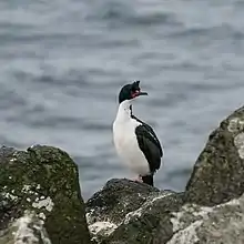Henry Forbes described the Chatham shag as Phalacrocorax onslowi in 1893. The specific name commemorates William Onslow, 4th Earl of Onslow, who was the Governor of New Zealand between 1889 and 1892.[2] The question of which genus to place the species in has, like the general question of the taxonomy of the cormorants and shags on the whole, been a long-standing mystery. It was long retained in Phalacrocorax along with the rest of the family when the family was treated as monogeneric. It was also placed in the genus Euleucocarbo along with the other "blue-eyed shags" found in New Zealand. The species has sometimes been considered a subspecies of an enlarged New Zealand king shag species (Leucocarbo carunculatus).[3] Most recently a 2014 study of the mitochondrial and nuclear DNA of the family placed it within the New Zealand blue-eyed shags and the other Antarctic blue-eyed shags in the genus Leucocarbo.[4] This arrangement has also been adopted by the International Ornithologists' Union.[5] The same study found that its closest relative was the species formerly known as Stewart shag.[4] Since 2016, the Stewart shag is now treated as two species, the Otago and Foveaux shags. The same study that split these two species also found that the Chatham shag is closely related to the Otago shag and that this pair are in turn a sister clade to the Foveaux shag.[6] These three species are in turn related to the New Zealand king shag and an extinct Leucocarbo species, the Kohatu shag, from the far north of New Zealand.[7]